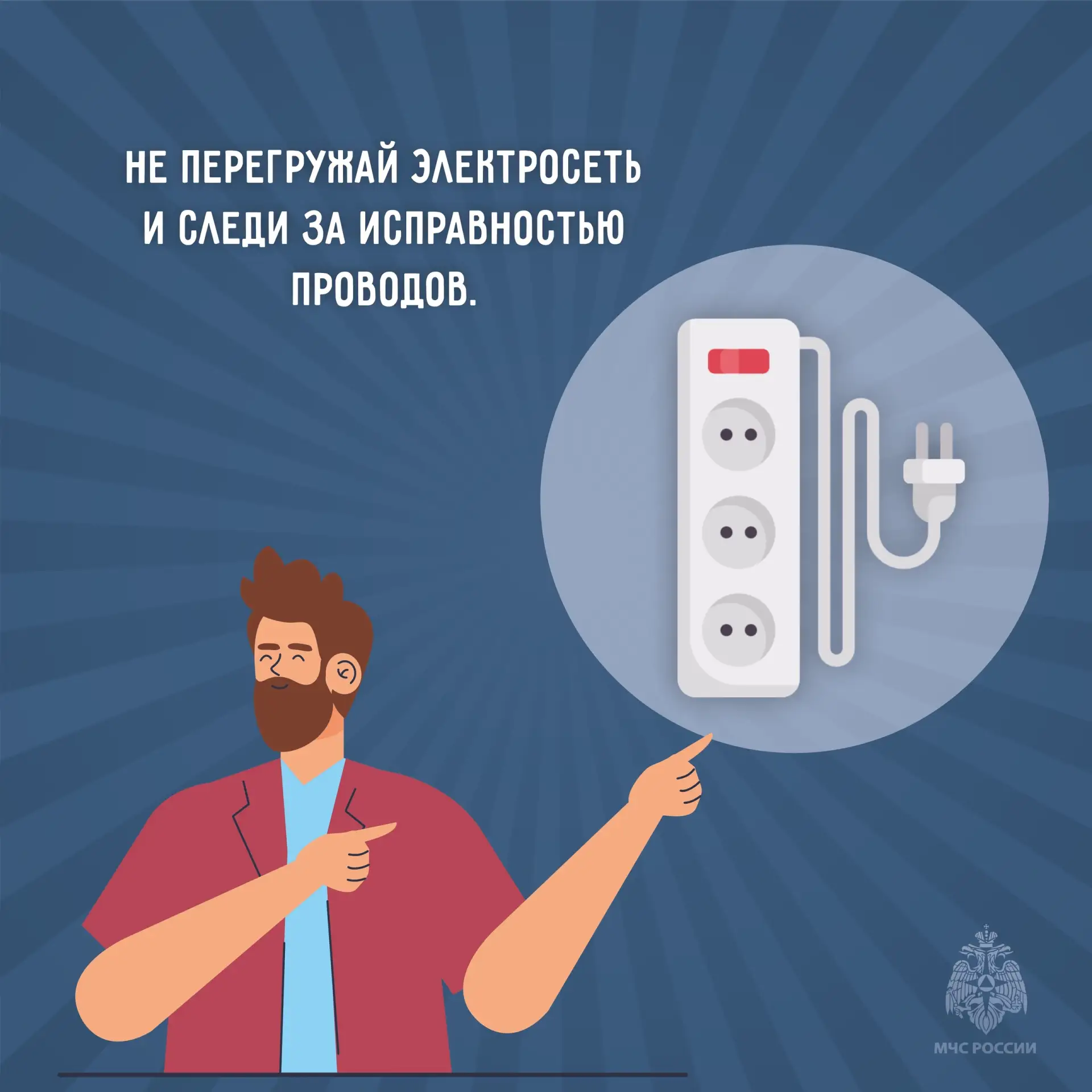 Дома: проверяй исправность электроприборов и проводки. Не перегружай розетки, не оставляй включенные электроприборы без присмотра, особенно утюги и обогреватели.