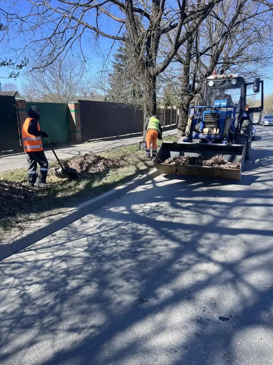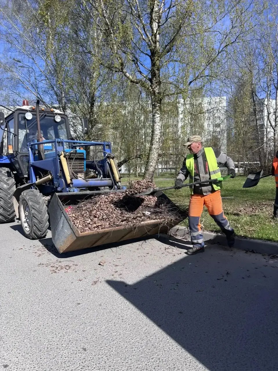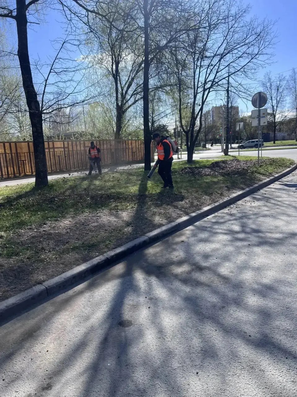 На этой неделе в районе Запсковья специалисты коммунальных служб продолжают работы по сезонному сгребанию прошлогодней листвы и растительности с зеленых зон.