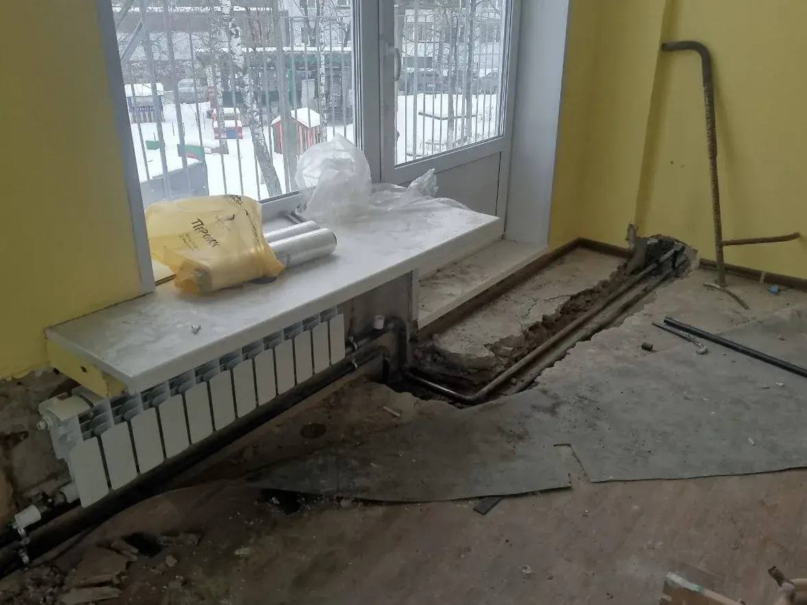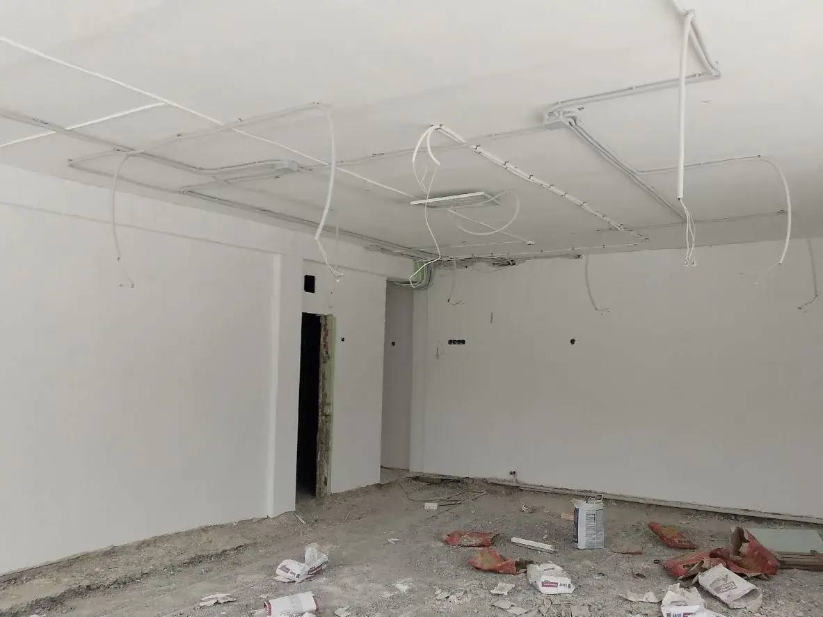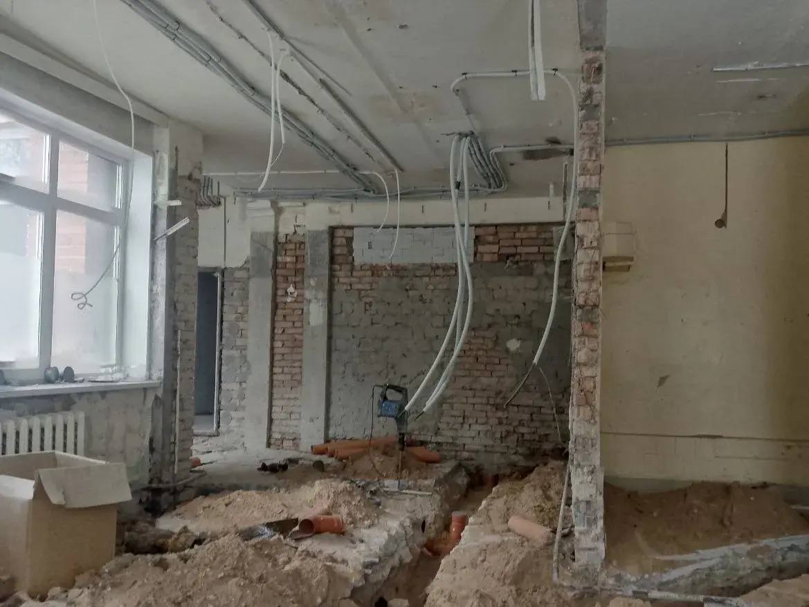 Внутри помещений перемены тоже заметны. Выполнен большой объём работ по подготовке стен: старая отделка удалена, и на многих площадях уже нанесена свежая штукатурка со шпаклёвкой. Параллельно идет устройство новых напольных покрытий и монтаж потолочных конструкций. Ремонт затронул и пищеблок.