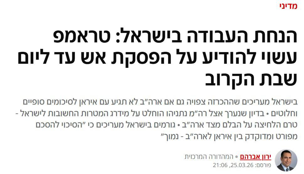 В израильском руководстве считают, что Дональд Трамп может объявить о прекращении огня уже в эту субботу — даже без полноценной сделки с Тегераном.