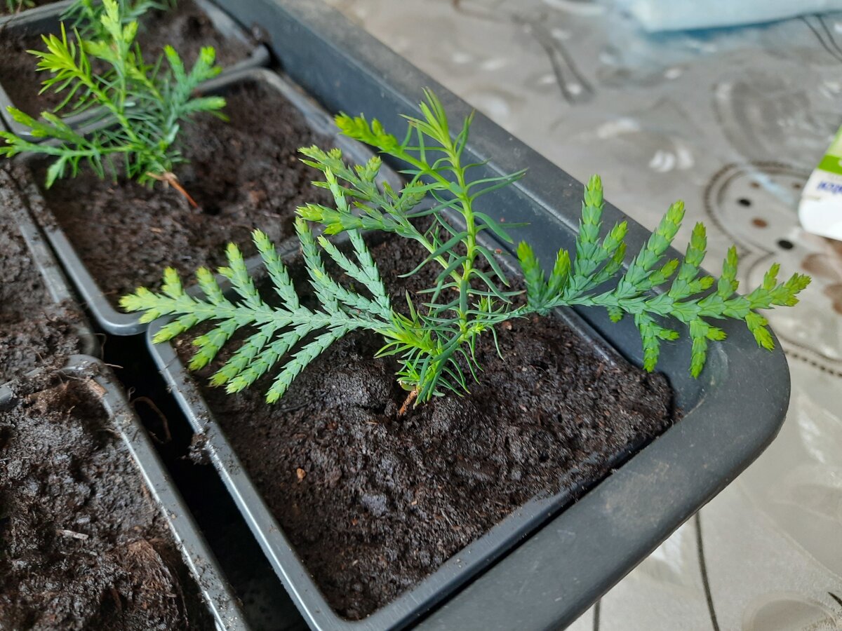 На большинстве сеянцев начали появляться побеги, обладающие характерными для туи формами. Тем не менее, детская хвоя также продолжает сохраняться, создавая интересный контраст. Замечено, что зеленая масса активно увеличивается, в то время как стволы остаются довольно худыми, что приводит к падению нескольких растений. Некоторые экземпляры даже получили повреждения стволиков.