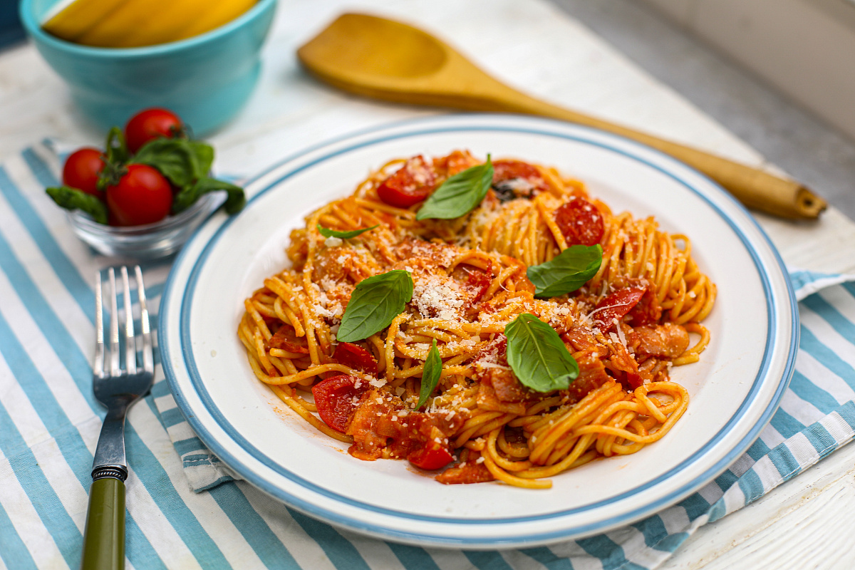 Этот аппетитный рецепт спагетти легко приготовить и он станет отличным решением для быстрого обеда или ужина. Бекон, свежие томаты и ароматный базилик создают атмосферу тепла и уюта на вашей кухне.