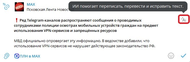 Встроенный ИИ-редактор позволяет автоматически корректировать ошибки, изменять стиль текста (Formal, Short, Tribal, Corp, Zen, Biblical и Viking) и переводить его на другие языки. Функция активируется нажатием на кнопку «AI» при вводе текста объемом не менее трех строк.