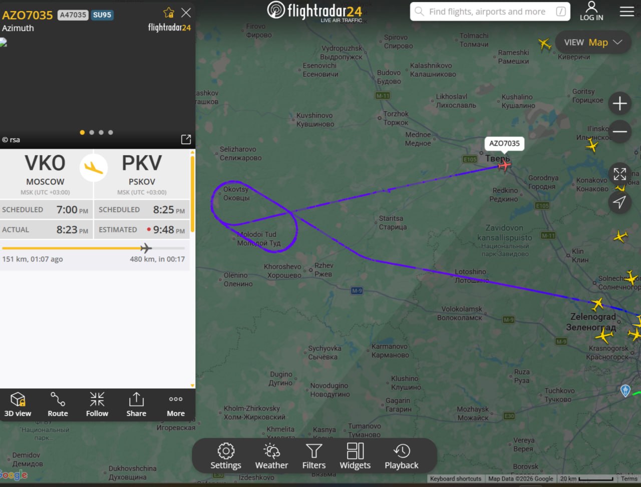 - Осталось разобраться, закрыт аэропорт Пскова или не закрыт? Потому что Росавиация о закрытии аэропорта пока не сообщала. Самолет Москва—Псков, между тем, вылетел из Внуково в 20:24 в направлении Пскова. ПЛН в MAX// Псковская Лента Новостей