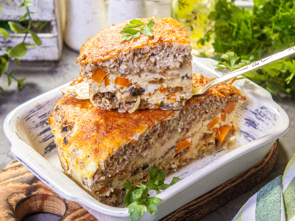 Эта аппетитная запеканка, в которой гармонично сочетаются куриное мясо, гречка и грибы, порадует каждого. Нежная текстура и сливочно-яичная заливка не только придают блюду утонченность, но и обеспечивают идеальную форму, а румяная сырная корочка дарит незабываемый вкус. И все это — за доступную цену!