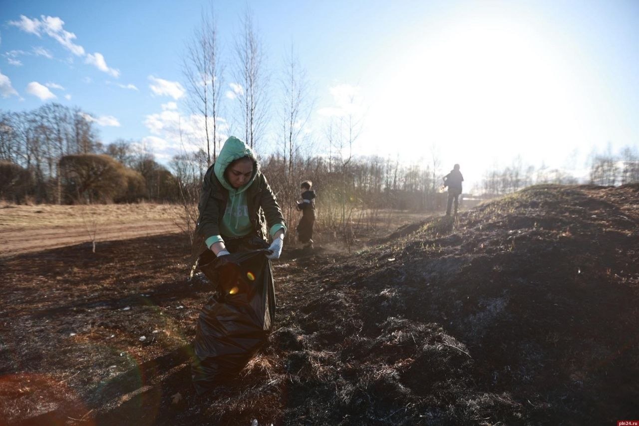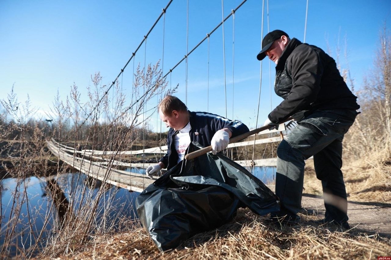 Субботник состоялся у подвесного моста в псковском микрорайоне Любятово
