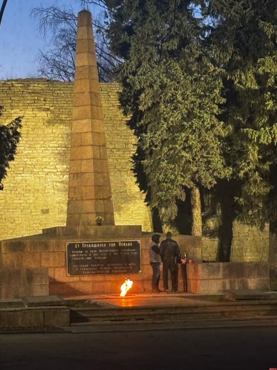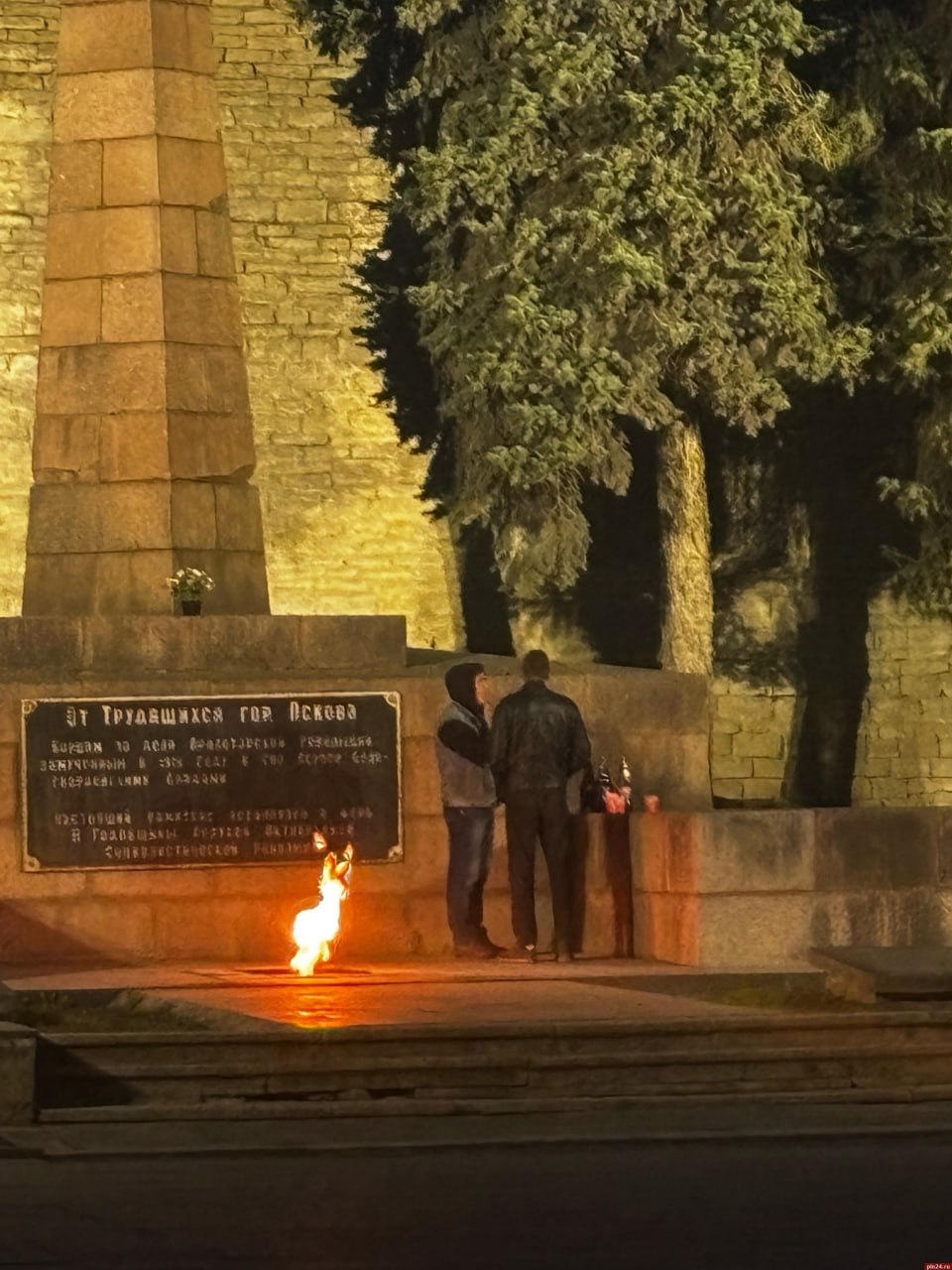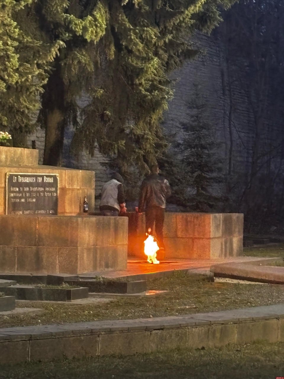Двое мужчин распивают алкоголь у Вечного огня в сквере Павших борцов в Пскове