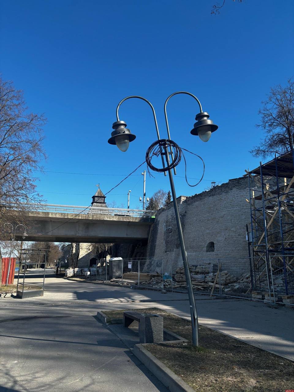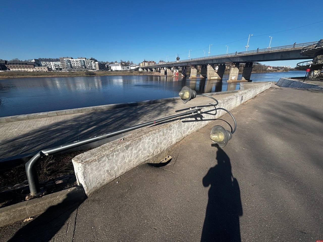На набережной реки Великой в Пскове погнулись уличные светильники