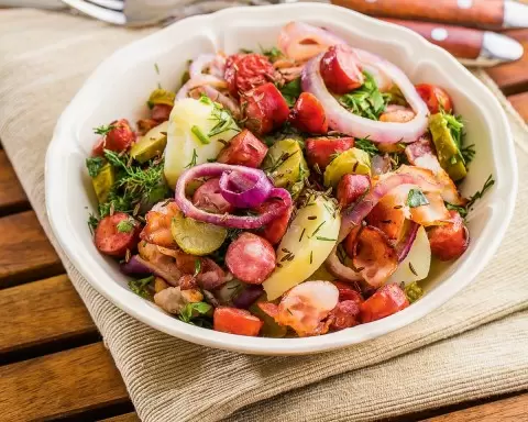 Баварский салат с охотничьими колбасками представляет собой удивительное гастрономическое путешествие, где соединяются ароматные колбаски, свежий картофель и яркие овощные акценты. Это блюдо удивительно универсально: оно подойдет как для семейного ужина, так и для угощения гостей на празднике. А главное — вы сможете быть уверены в качестве ингредиентов, ведь рецепт полностью домашний, без добавления искусственных наполнителей.