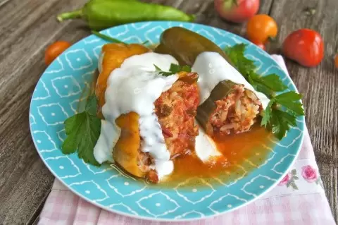 Закройте крышку мультиварки, выберите режим тушения и установите таймер на 40 минут. Блюдо будет готовиться до тех пор, пока не закончится программа. Если вы предпочитаете традиционную плиту, просто тушите фаршированные перцы на умеренном огне в течение 40 минут после закипания.