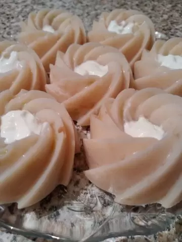 Агар-агар активно стабилизируется даже при комнатной температуре, и через два часа суфле будет готово. Аккуратно извлекая из формы, можно заполнить углубления густой сметаной для дополнительного вкуса и текстуры.