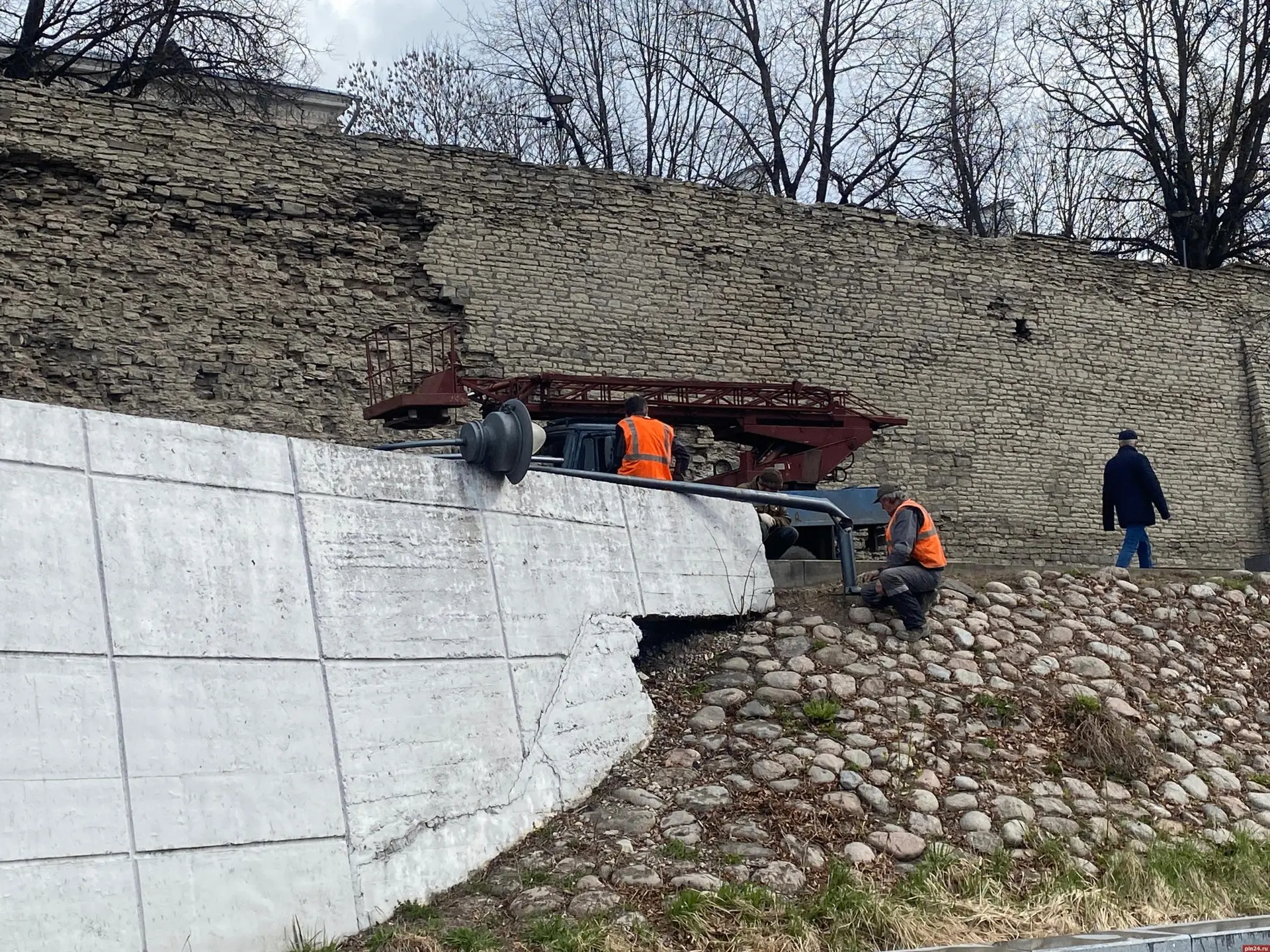 На набережной в Пскове выпрямляют погнутые светильники