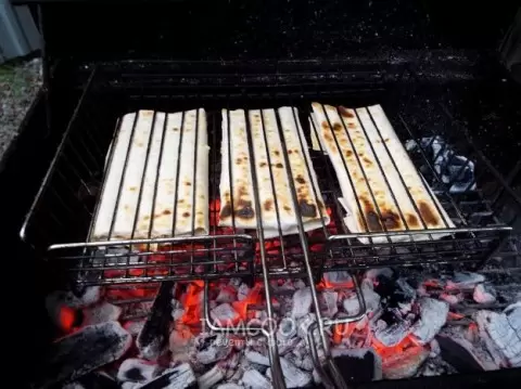 После этого конвертики можно выкладывать на решётку гриля и жарить на умеренном огне. Главное, чтобы сыр внутри плавился, а снаружи образовалась румяная корочка. Обычно на каждую сторону достаточно пары минут. Как только начнет пахнуть жареным сыром – пора снимать с огня.