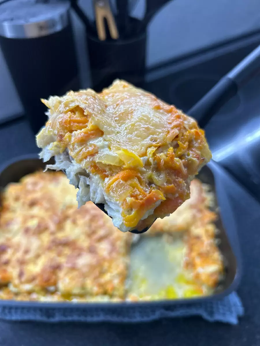Шаг 3: Сверху на минтай выложите лук с морковью и еще раз смажьте майонезом. Завершите начинки тертым сыром и запекайте в духовке при температуре 180 градусов в течение 35-40 минут.
