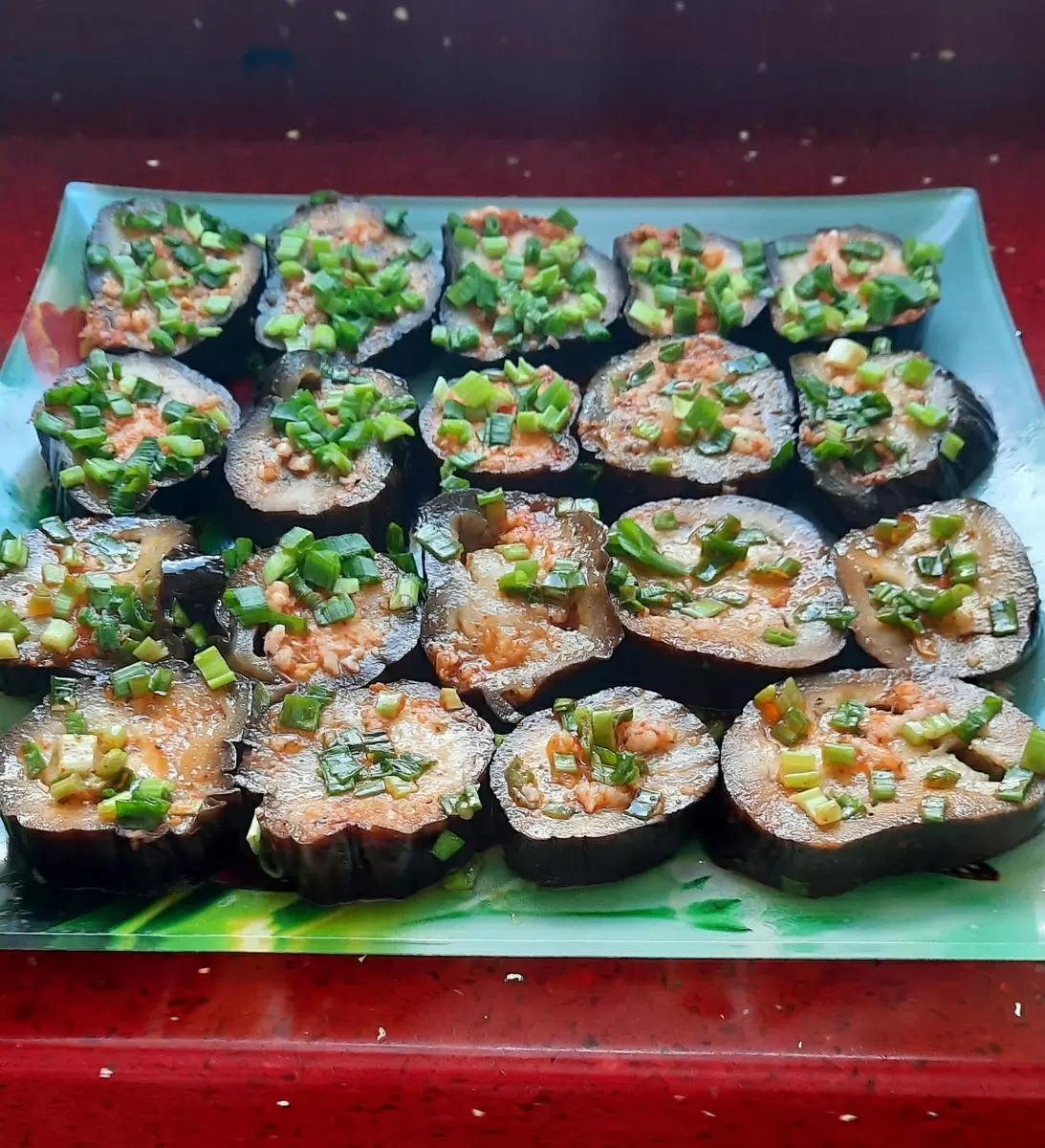 Когда баклажаны остынут, нарежьте их кольцами толщиной примерно 1 см, а зелёный лук мелко порубите.