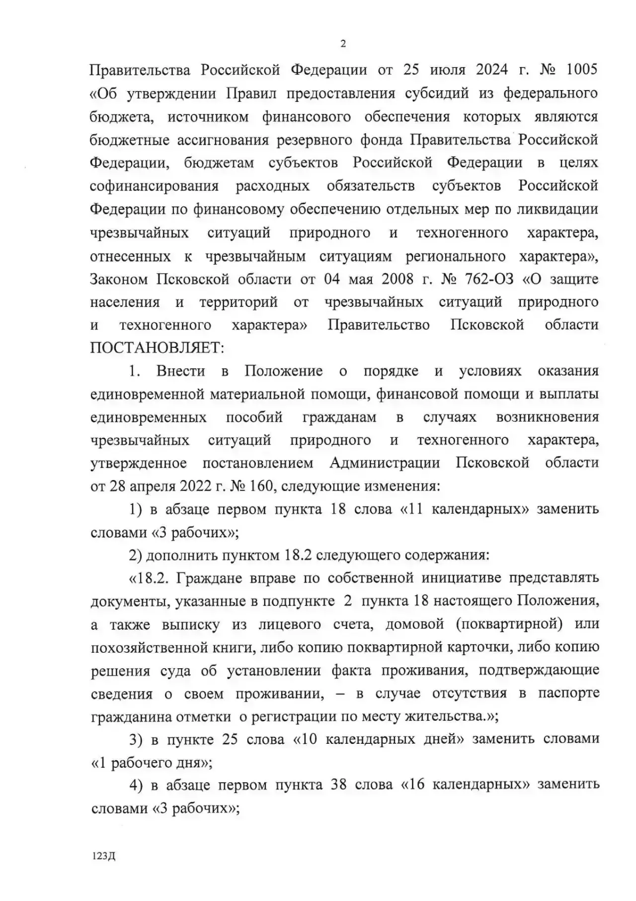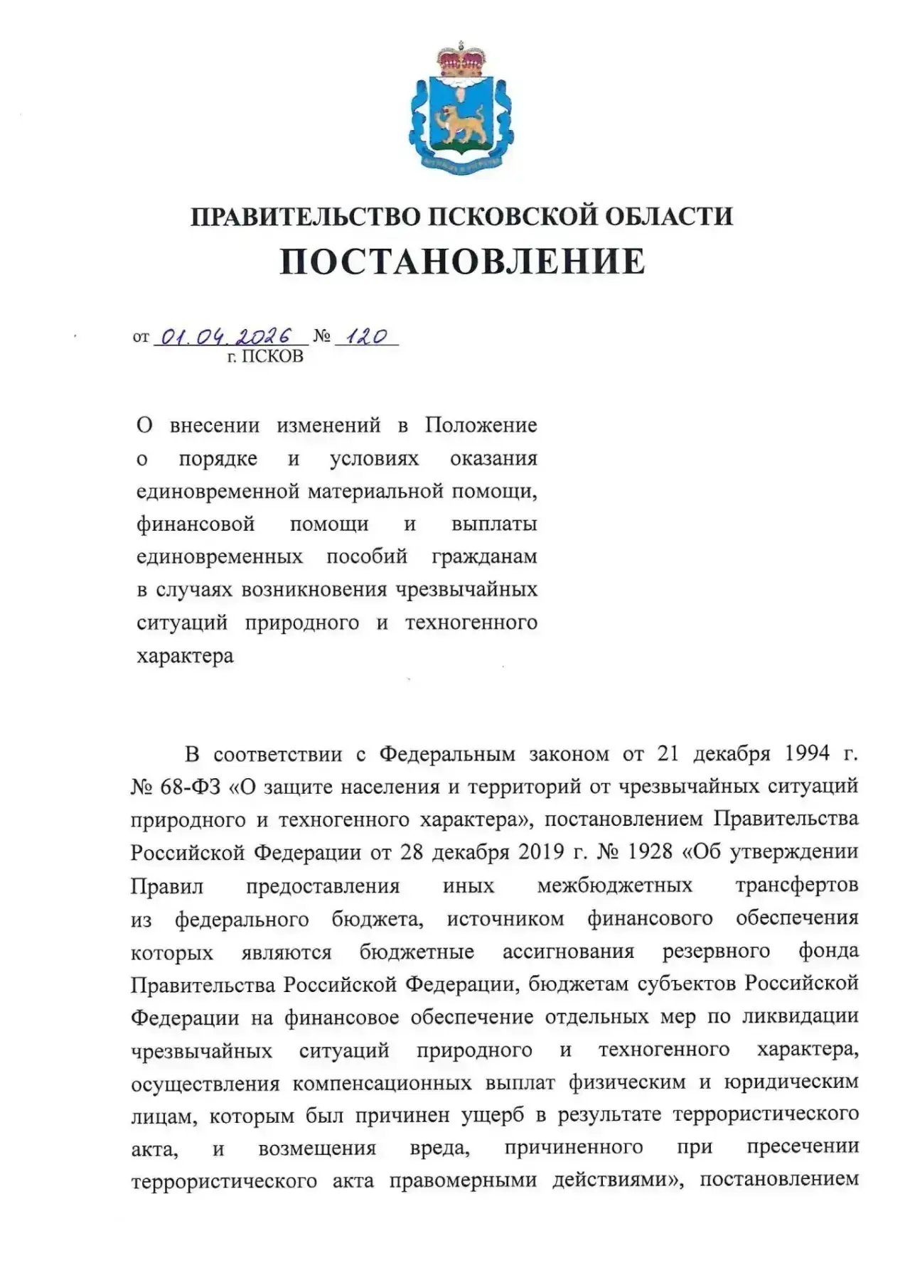 Срок рассмотрения заявлений граждан на получение единовременной матпомощи при утрате имущества в результате чрезвычайных ситуаций сокращён в Псковской области.