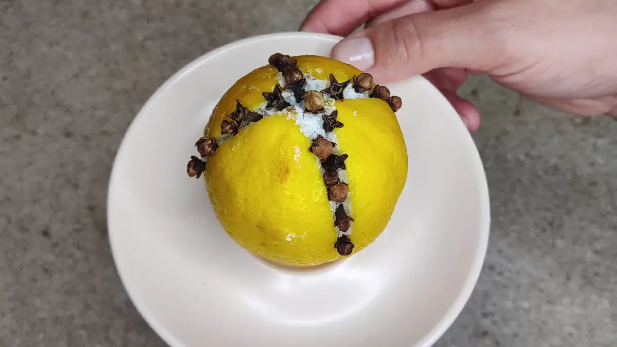 Третий лимон отлично подойдет для создания натурального репеллента. Отрежьте основание, сделайте крестообразный надрез, посыпьте солью и воткните в нее сушеные бутоны гвоздики.
