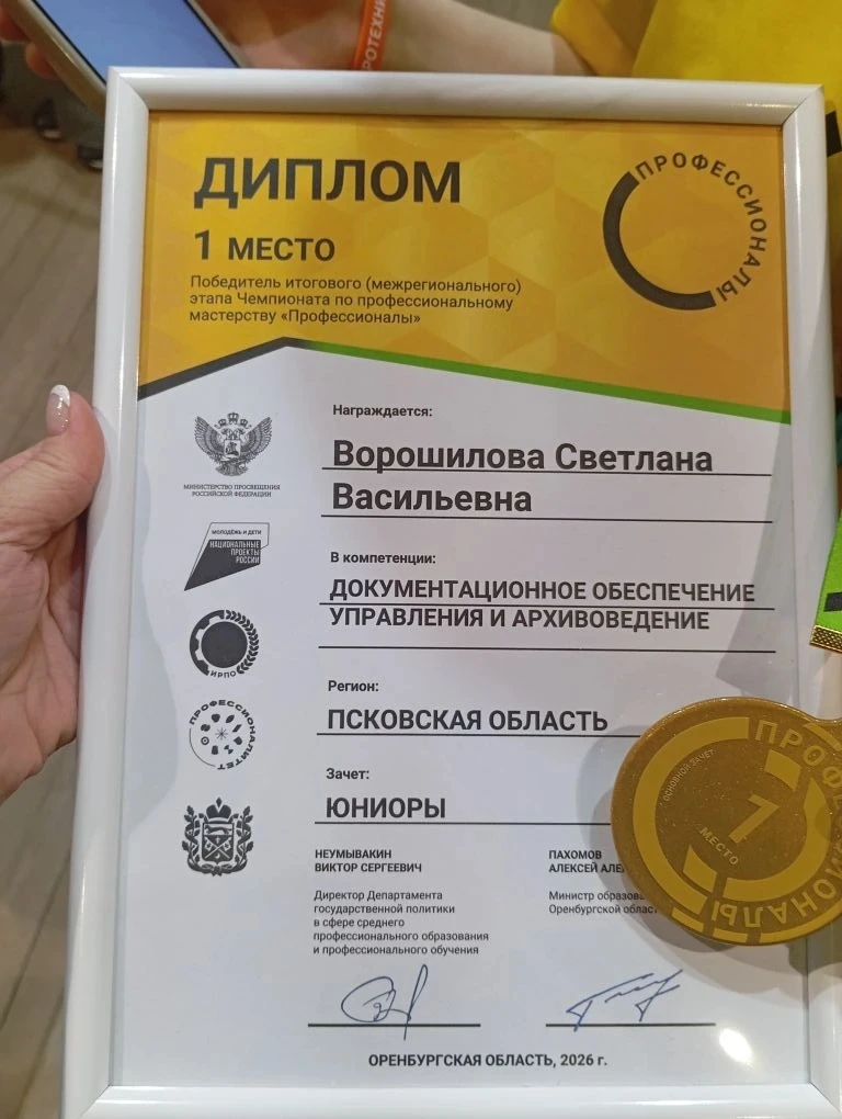 Светлана Ворошилова , учащаяся Средней общеобразовательной школы №16 им. Героя России , стала победителем итогового (межрегионального) этапа Чемпионата по профессиональному мастерству «Профессионалы» в группе «Юниор» компетенции «Документационное обеспечение управления и архивоведения