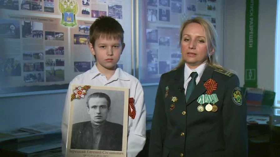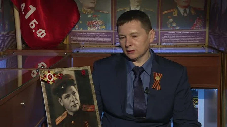 В кадре рассказчик с портретом своего родственника-фронтовика