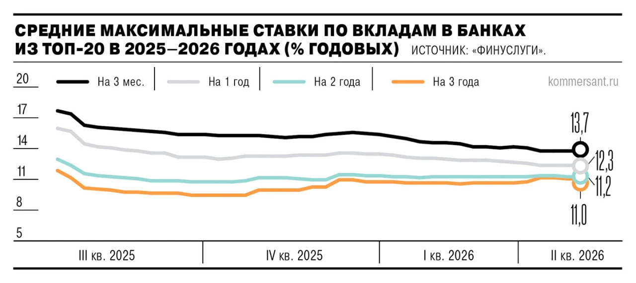 — При этом средние ставки по вкладам на полтора и два года остались на прежнем уровне — около 11,4% и 11,2% годовых соответственно.