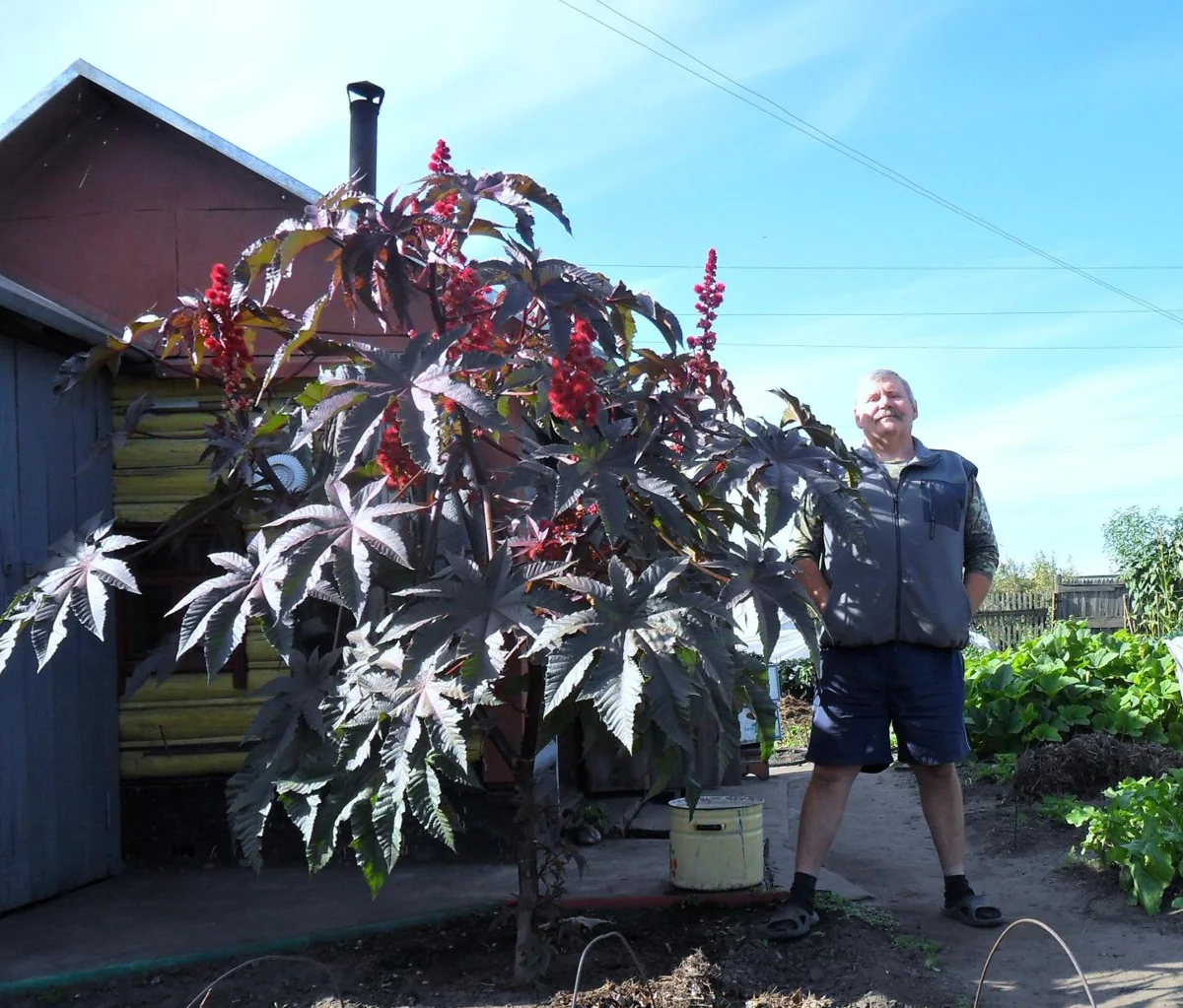 - Клещевина: Это растение быстро растет и радует глаз огромными листьями, достигающими высоты до 2 метров. Однако остерегайтесь: все части клещевины ядовиты, что требует осторожности при выращивании рядом с детьми и животными.