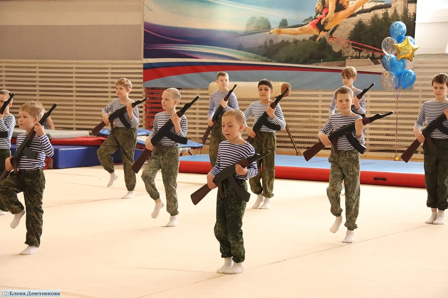 Особое место заняла военно-прикладная гимнастика — спортсмены продемонстрировали комплекс рукопашного боя и прыжки с макетами автоматов.
