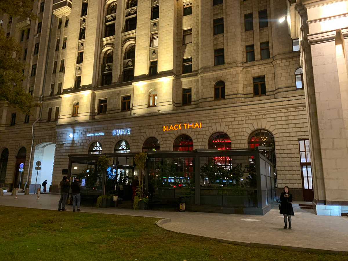 Black Thai расположился в знаковом гостиничном комплексе Radisson Collection, который когда-то был известен как "Украина". Интерьер ресторана сочетает в себе элементы традиционного тайского дизайна с изысканной роскошью сталинской архитектуры. Высокие потолки и знаменитая люстра с красными огнями создают неповторимое настроение.