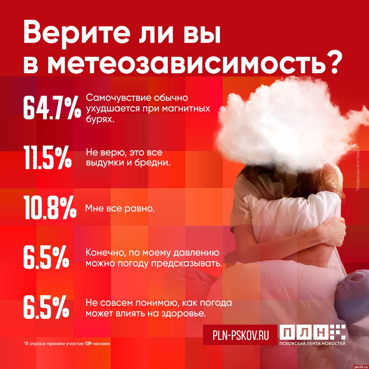 Большинство респондентов Псковской Ленты Новостей верит в метеозависимость: у 64% читателей ухудшается самочувствие при магнитных бурях.